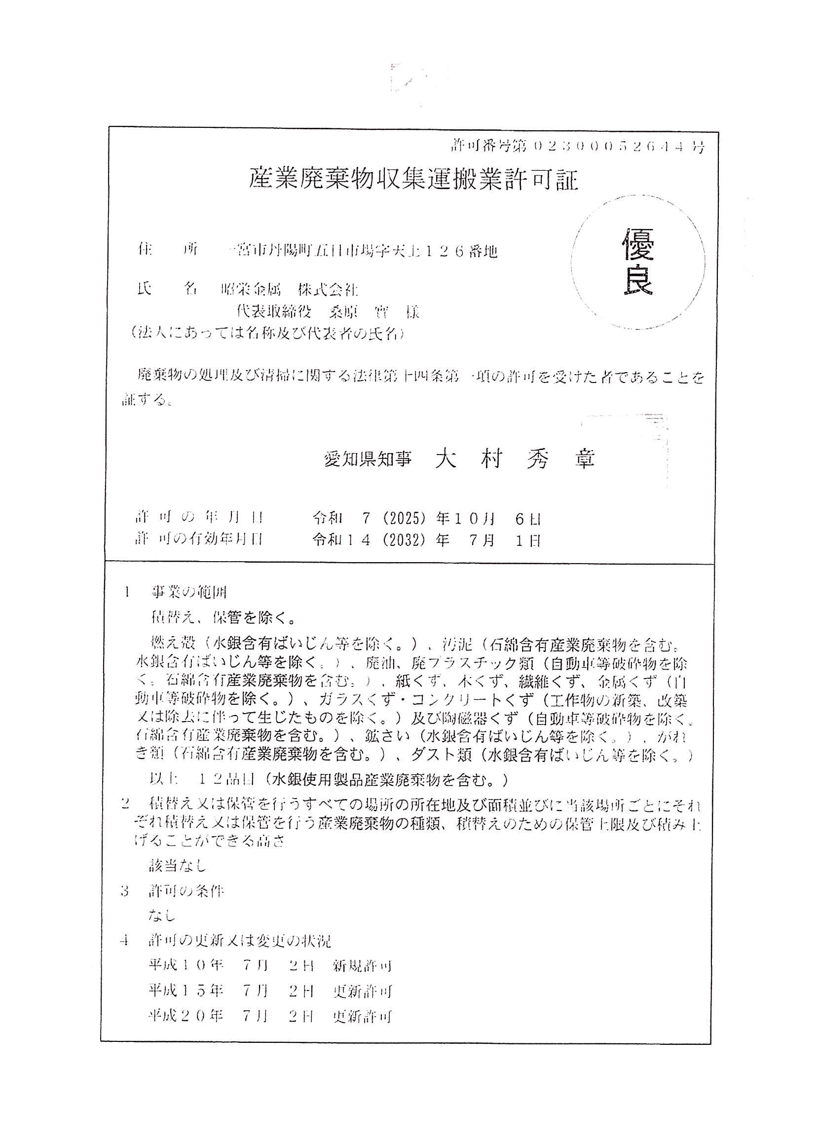 産業廃棄物収集運搬業 愛知県の許可を優良更新しました。